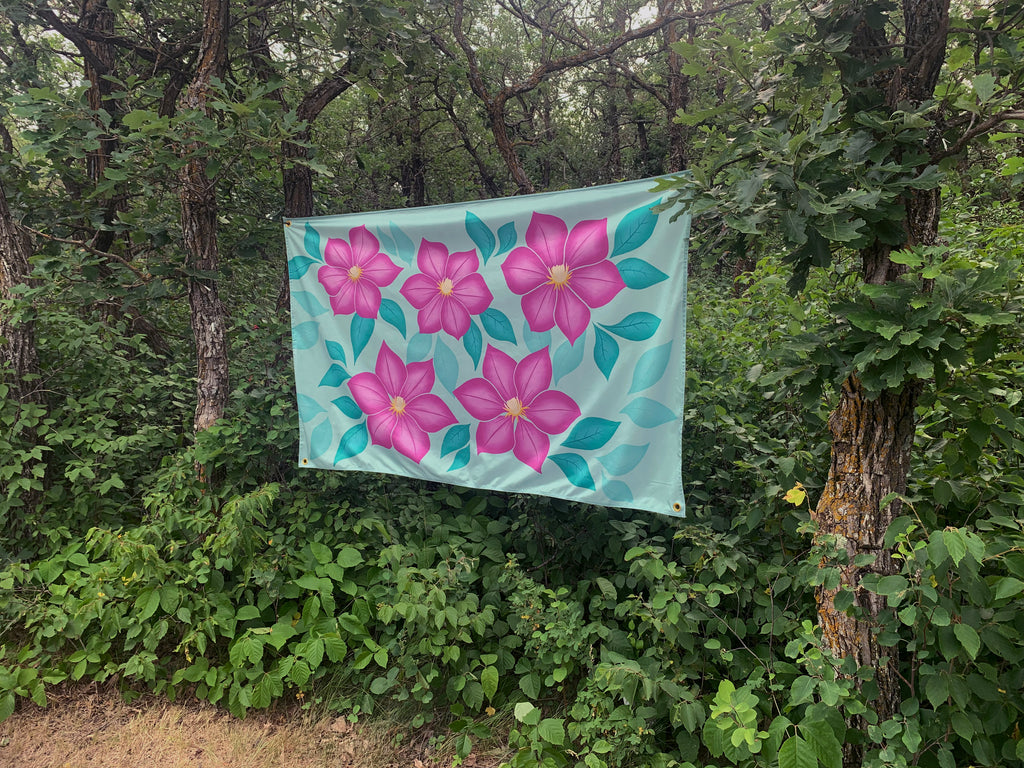 Transform your outdoor space with our Purple Blossoms flag! Perfect for adding a pop of color to your yard, balcony, or campsite - our decorative flags double as a practical privacy solution. (Not enough trees between your campsite and the neighbours, for instance?). Featuring four sturdy grommets for easy installation, it's ready to flutter in the breeze and brighten any outdoor setting. Whether you're creating a cozy retreat or simply want to express your love of nature, this whimsical flag brings personality and purpose to your space.